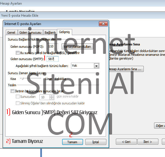 Burada sadece “Giden sunucusu (SMTP)” Değerini 587 yapıyoruz ve “Tamam” Diyoruz.